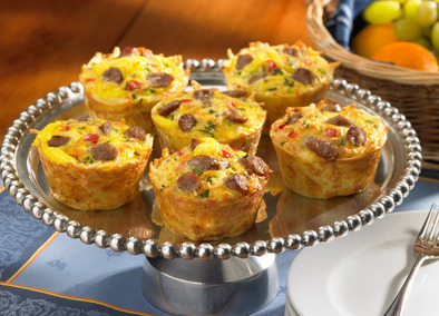 1. In a bowl, combine the hash browns, butter, salt and pepper. Press mixture onto the bottom and up the sides of greased muffin cups. Bake at 400°F for 12 minutes or until lightly browned.
