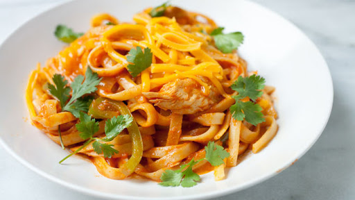 Top pasta with grated cheese, turn heat down to very low, and cover the pot for one minute to melt cheese. Serve pasta garnished with fresh cilantro.