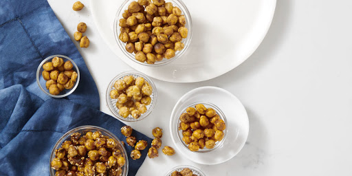 Maple-Cinnamon: Follow Original Recipe instructions, then toss roasted chickpeas in maple syrup, sugar, cinnamon and nutmeg. Return to oven for 5 minutes until caramelized and crisp.