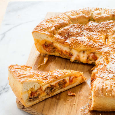 5. Brush top of calzone with egg wash and sprinkle with sesame seeds, if using. Using paring knife, cut eight 1-inch vents in top of dough in circular pattern. Transfer skillet to oven and bake until crust is golden brown, about 30 minutes, rotating skillet halfway through baking.