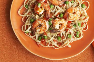 Shrimp are sautéed with garlic, basil, peas, wine and tomatoes, then poured over prepared linguine and topped with mozzarella cheese and baked. You can prepare this ahead of time and just heat in the oven.