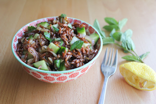 In a large bowl, toss together the rice, cucumbers, chopped herbs and dressing. Serve immediately with lemon wedges on the side. Or refrigerate, and toss before serving.