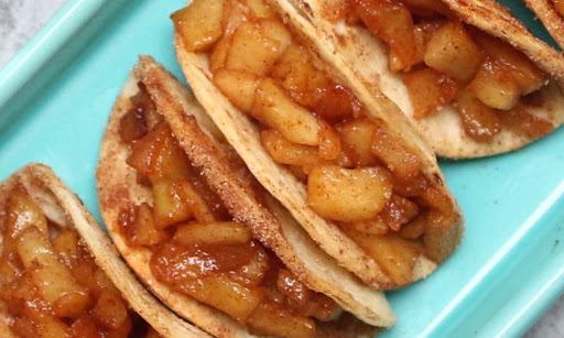 Add apple mixture to tortillas. Then top with caramel sauce and whipped cream. Serve and enjoy!