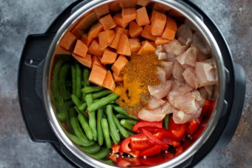 2. Then turn to manual setting and set temp to high. Add the chicken, sweet potatoes, red pepper, green beans, broth, curry, cumin, turmeric, cayenne and sea salt. Seal the instant pot and set time for 15 minutes.