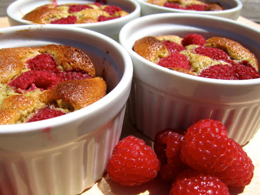 3. Divide batter equally among ramekins; sprinkle with raspberries. Place on a rimmed baking sheet; bake until firm and pulling away from sides, 20 to 25 minutes. Serve warm (or at room temperature).
