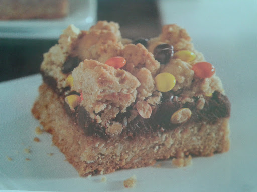 Heat oven to 350. Beat butter, peanut butter and brown sugar until well blended. Add eggs and vanilla; beat thoroughly. Stir together oats, flour, baking soda and salt; gradually add to butter mixture. (Dough will be thick.) Remove 2 cups dough; set aside. Press remaining dough onto bottom of 13x9 inch baking pan. Prepare CHOCOLATE FILLING. Spread filling evenly over dough. Sprinkle candy pieces evenly over filling. Crumble reserved dough evenly over filling. Bake 25 minutes or until top is golden brown. (Chocolate will be soft.) Cool completely in pan on wire rack; cut into bars.