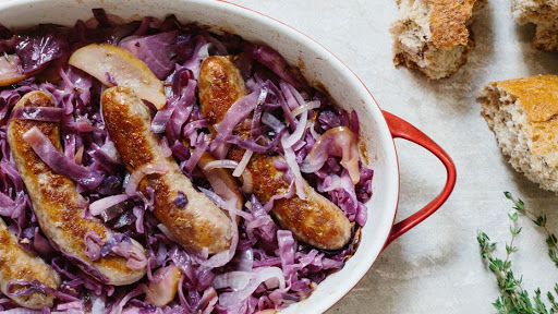 The classic roasted sausage and cabbage recipe combo is lightened up with some apples and red wine vinegar. Use any sausage you like—we like a spicy turkey for this dish.