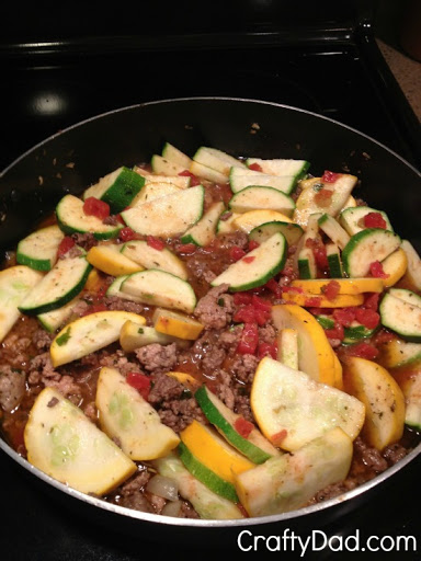 Once the beef and pork are cooked, add the zucchini and yellow squash. (You may need to reduce the heat at this point.)
