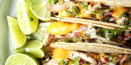 4. Assemble tacos: Top tortillas with shredded cabbage, chicken, salsa, cheese sauce, and cilantro. Serve with lime wedges.