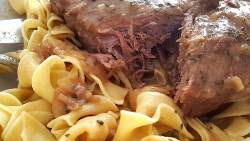 1. In a slow cooker, mix cream of mushroom soup, dry onion soup mix and water. Place pot roast in slow cooker and coat with soup mixture.