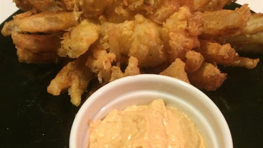 7. Fry the onion right side up in the oil for 10 minutes or until it turns brown. When the onion has browned, remove it from the oil and let it drain on a rack or paper towels. Open the onion wider from the center so that you can put a small dish of the dipping sauce in the center.