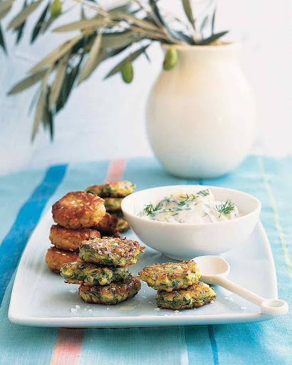In a 12-inch saute pan, heat 2 tablespoons oil over medium-low heat. Cook half the patties, without flattening, until golden brown, about 3 minutes per side. Transfer patties to a paper-towel-lined plate, and season with salt. Repeat with remaining patties and tablespoon oil. Serve immediately with tzatziki.