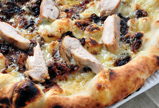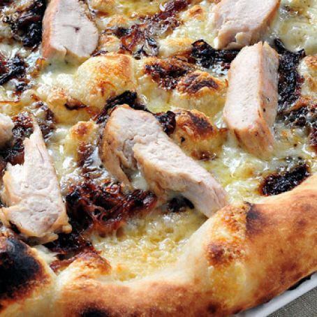 Form the first dough to roughly a 12-inch pizza crust. Top with half the roasted garlic white wine mixture in small dollops. On top of that, add half the cheese and then the caramelized onions. Slice the chicken breast and place half onto the pizza. Transfer to a pizza peel.