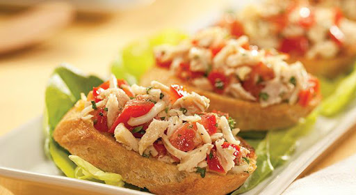 Place about 1⁄4 cup mixture on each piece of toast. Place one piece of Bruschetta on each lettuce-lined plate.