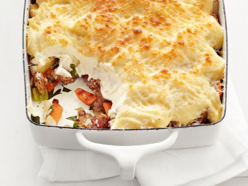 Drain the potatoes and mash with the remaining 3 tablespoons butter and the milk; season with salt and pepper and spoon over the casserole. Sprinkle with parmesan, if desired. Broil until golden brown, 5 minutes.