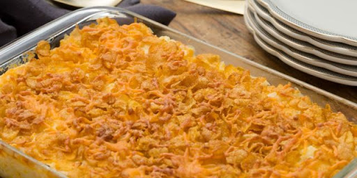 4. In a medium bowl, combine cornflakes and butter. Top casserole.