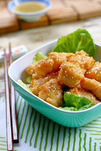 Here, you can either dish out some sauce for dipping later and just keep enough to coat the fried chicken cubes in the wok, OR, toss in the chicken and briefly stir well, making sure the chicken is well coated in the sauce, dish out and sprinkle some toasted sesame seeds and serve. Alternatively, you can also keep the sauce separate from the chicken, and dip as you eat. Serve Chinese Honey Chicken with a bowl of hot steamed Jasmine rice or serve as is, with extra toasted sesame seeds to garnish.