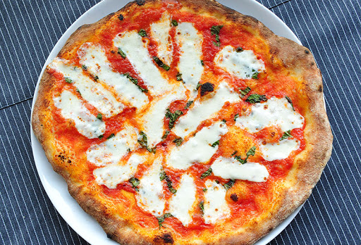 Working on a lightly-floured surface (we use Caputo ’00 flour), form the dough into a 10-inch pizza. Spread the sauce into an even layer. Grate a little Pecorino onto the sauce using a microplane grater. Distribute the basil, followed by the strips of fresh mozzarella.