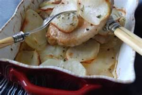 Brown chops. Put in potatoes, chops, mushrooms, water, and soup in casserole. Cover with foil.