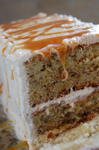Cut cake into two equal rectangles. Spread 3 TBSP peanut butter on top of bottom layer. Add a layer of buttercream on top of the peanut butter. Place second layer on top. Frost cake with remaining frosting. If you like, drizzle caramel over top of cake.