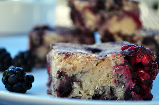 Fold in the blackberries and spoon the batter into the greased pan. Bake for 40 minutes or until the sides are golden.