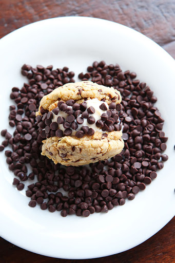 Now if you want to take these cookies over the top, turn them into the ultimate ice cream sandwich by placing a scoop of ice cream on one cookie, top with a second cookie, and cover in more mini chocolate chips.