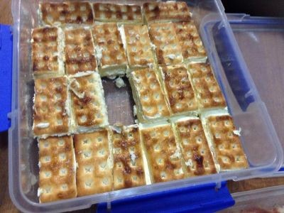 STEP 4 Place lattice biscuits in base of a slice tin, sugar side down.
