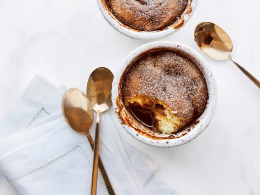 Preheat the oven to 350 degrees F. Lightly butter six 8-ounce ramekins and set on a baking sheet; set aside. Put the butter and milk in a medium microwave-safe bowl and microwave in 30-second intervals until the butter is melted. Add 1/2 cup granulated sugar, the vanilla and salt and whisk until smooth. Add the flour and baking powder and whisk until smooth. Divide among the prepared ramekins.