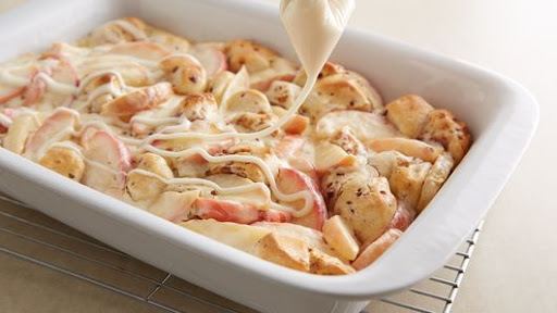 3. Separate dough into 5 rolls; return icing to refrigerator. Cut each cinnamon roll into 6 pieces, and stir into apple mixture. Pour into baking dish.