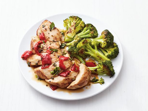 Remove the chicken to a cutting board. Increase the heat to medium high and continue simmering the sauce until slightly reduced, 2 to 3 minutes. Stir in the parsley and season with salt. Slice the chicken, divide among plates and top with the sauce. Serve with the broccoli.