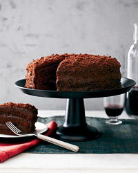 Set one of the cake bottoms on a cake plate and spread with 1 1/2 cups of the filling. Top with the second bottom layer and another 1 1/2 cups of filling. Cover with the cake top and spread the remaining filling all over the top and side. Pat the crumbs all over the cake. Refrigerate for at least 1 hour before serving.