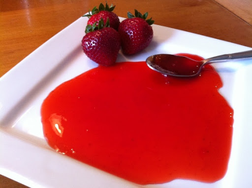 Remove from heat. Using a strainer, pour liquid into a bowl ensuring to press as much juices through strainer with wooden spoon. Dispose any of the solid strawberries leftover from mixture, and return liquid to pan on low heat.