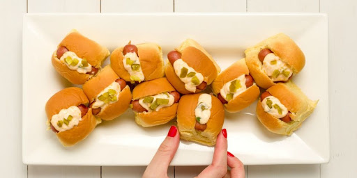 Meanwhile, heat hot dogs, and top-split dinner rolls to make mini hot dog buns. Place hot dog in each bun, then top with a little dip and a few chopped jalapeños. Serve immediately.