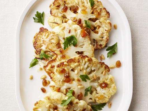 Cauliflower steaks are roasted in the oven in a drizzle of olive oil and baked until golden brown and served with a sweet buttery sauce including golden raisins and pine nuts.