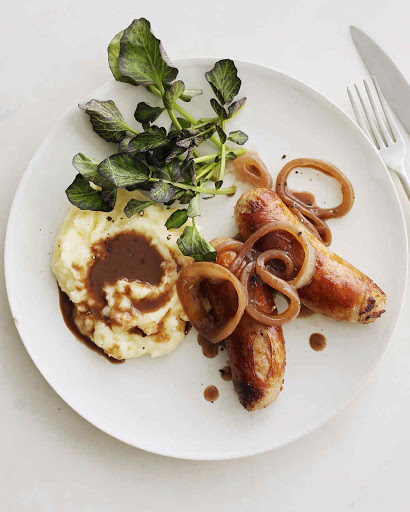You'll want to use bonafide bangers (British pork sausage) for an authentic bangers & mashed potatoes dish. Add to that a scrumptious onion gravy prepared by deglazing the pan and you got a winning recipe!
