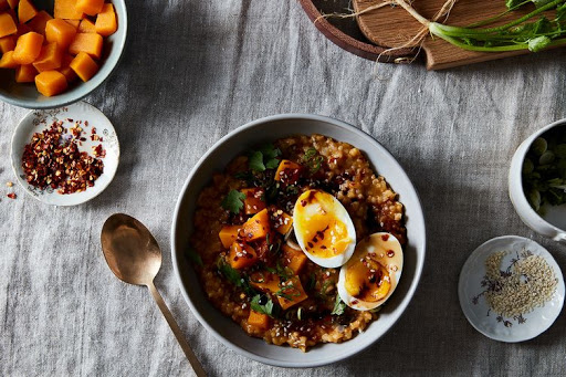 A healthy and filling Butternut Squash Brown Rice Porridge with Asian spices. Adding the squash purée along with cubed squash gives it a little more substance. Choose your favorite toppings, soy sauce, fresh lime juice, cilantro, scallions, a fried egg, chili flakes, or sesame seeds. The options are limitless!