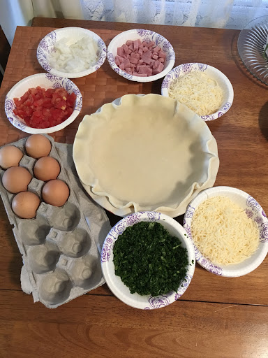 Because I use store-bought pie crust and they come in a package of two, as I’m preparing the ingredients I set up for 2 quiches (See photo here for how I did it for one quiche).