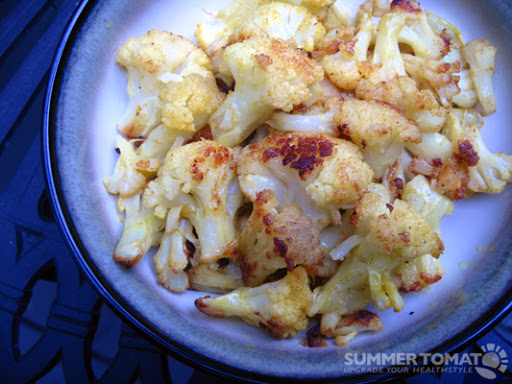 Preheat oven to 500 degrees. Break cauliflower into medium-small florets and place into large bowl or baking pan. Be sure the pieces are as evenly sized as possible, or they will cook unevenly. The smaller you make the pieces, the quicker they will cook and the more caramelized they will become, which I consider a good thing.