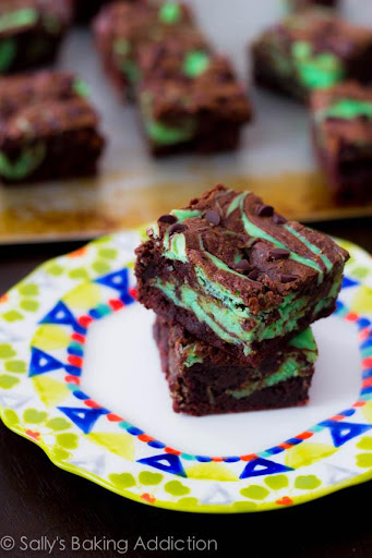 4.Make the cheesecake swirl: With a hand-held mixer on medium speed, beat the softened cream cheese, 1/4 cup sugar, egg yolk, 1/4 teaspoon peppermint extract, and 2 drops of food coloring in a medium bowl until completely smooth - about 1 minute. Manually stir in the mini chocolate chips. Dollop spoonfuls of the cream cheese mixture on top of the prepared brownie batter. Cover with the last 1/4 cup of brownie batter. Glide a knife through the layers, creating a swirl pattern. Add more mini chocolate chips on top, if desired.