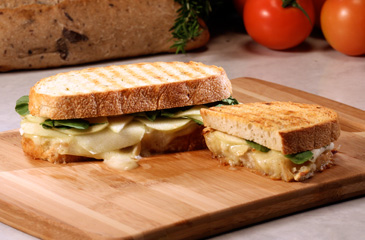 Place the sandwich in the panini maker or skillet and grill according to instructions noted above. When done, transfer the sandwich to a cutting board and slice in half using a serrated knife.