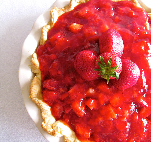 Beat cream cheese until smooth. (If you decide to skip this step, give me a call so I can mock you as you destroy your pie crust trying to spread unyielding cream cheese.) Spread on bottom of pie shell. Fill shell with remaining strawberries. Pour cooked strawberry mixture over top. Cover* and refrigerate until set, at least three hours, and serve with fresh whipped cream.