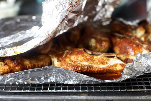 Prepare chicken: Heat oven to 300 degrees. Remove chicken parts from brine and pat dry. Place pieces of chicken on two very large pieces of foil, large enough to fold over chicken and form packets. Pat chicken pieces generously on all sides with rub; do not be shy about using more than seems… seemly. Turn the chicken pieces so their meatier sides are down, and tightly fold the foil around them to make two large packets.
