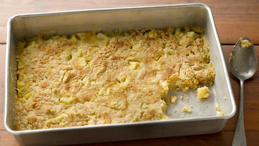 2. Place chopped apples in pan. Top with dry cake mix, and pour melted butter over top, making sure to cover top with butter as much as you can.