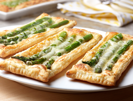 Roll the puff pastry out to a 16×10 inch rectangle. Score a line around the puff pastry 1 inch from the edge. Brush the mustard around the inside of the cut. Sprinkle the cheese over the mustard. Arrange the asparagus in a single layer over the cheese. Season with salt and pepper. Brush the outside inch of the pastry with the oil. Bake in a preheated 400F/200C oven until the asparagus is tender and the pastry is golden brown, about 15-25 minutes.