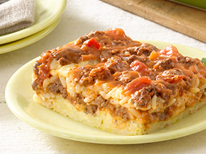 Spoon one-half of rice mixture into baking dish. Cover with one-half of cheese mixture. Top with one-half of meat sauce. Repeat layers. Top with remaining 1/4 cup Parmesan cheese.