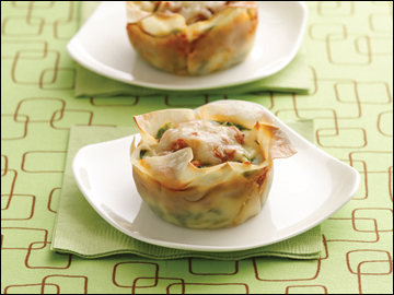 Evenly distribute about half of the turkey mixture among the cups, smoothing the surfaces with the back of a spoon. Top each turkey layer with 1 tbsp. mozzarella cheese. Place another wonton wrapper into each cup, lightly pressing it down on the cheese layer and along the sides of the cup, letting the edges fall over the pan. Repeat layering by evenly distributing remaining spinach-ricotta mixture and turkey mixture among the cups. Top each cup with 1 tbsp. mozzarella cheese.