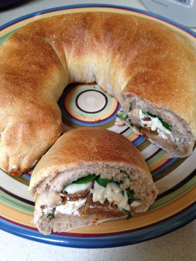 Roll dough out into a rectangle, ¼” thick. Lay the ingredients down into a wide swath along the dough leaving 1-2" along each side. Then roll the dough lengthwise and press into a nice, thick tube. Squish down the ends and form the dough into a “U” shape, so that it will fit inside your fryer basket. Brush the top with a bit of aquafaba and carefully place inside the basket.