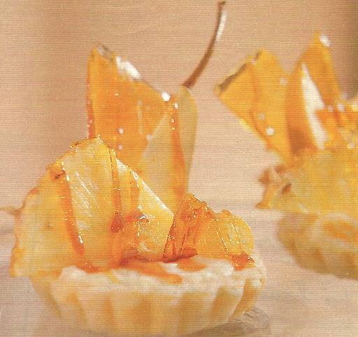 5. To assemble, spoon pudding into tart shells. Cut pears into wedges; core. Brush cut surface with lemon juice. Stand assorted fruits up and, if desired, arrange Caramel Spikes on top of tartlets. If desired, prepare and drizzle each tartlet with Crackly Caramel Sauce. Makes 8 servings.