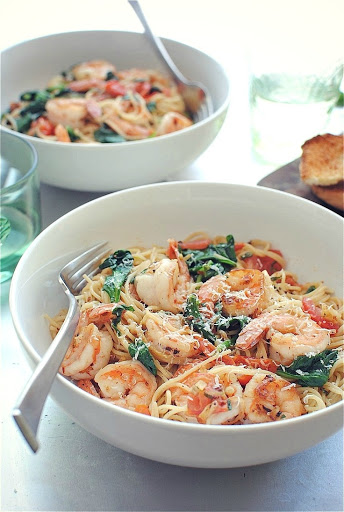 In the meantime, bring a large pot of salted water to a boil and cook the angel hair until al dente, maybe 5 minutes. Drain all but about 1/2 cup of the pasta water and toss with the shrimp and tomato mixture, along with the spinach. Squeeze a lot of lemon juice right in. Season with coarse salt and pepper. Add as much pasta water as you want to create a thin, glorious sauce.