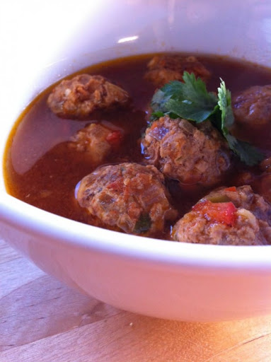 I made the meatballs pretty small so they would cook quickly and be more bit-sized (because who wants to use a knife to cut their soup?!) and simmered them in a beef broth enhanced with diced tomato and chunks of yam. The smoked paprika I added to the meatballs really worked well with the hearty broth.